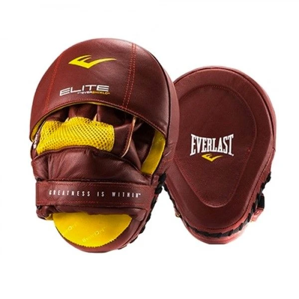 Everlast Elite Leather Punch Mitts – Part of the ELITE training line, the Mantis Mitts are designed with the coach in mind. Anatomically contoured hand design, additional gel lining and advanced multi-layered foam ensures hands, wrists and palms are supported and protected. A mesh outer pocket with EVERDRI technology keeps the trainers hands cool during intense training. The striking surface is constructed with premium full-grain leather for long lasting durability and includes a recessed striking target. Featuring a close finger design with a velcro wrist strap for improved safety and fit.